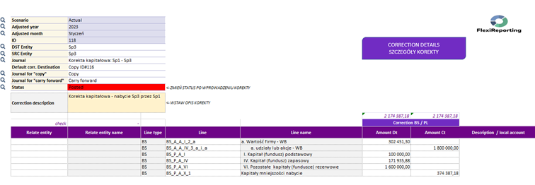- możliwość wprowadzania korekt konsolidacyjnych ręcznie, co zapewnia dokładne eliminacje w transakcjach,