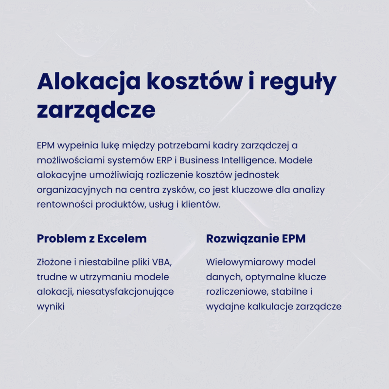 System EPM oparty o wielowymiarowy model danych, w którym odwzorowane zostaną produkty, usługi czy klienci firmy może być dobrym narzędziem do budowy modelu rozliczania kosztów. Wszelkie kalkulacje zarządcze naturalnie wpisują się w koncepcję zarządzania efektywnością.