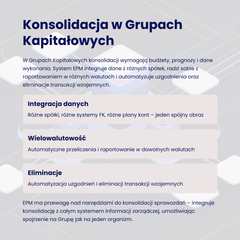 Problem konsolidacji danych z wielu spółek pojawia się wyłącznie w Grupach Kapitałowych. Natomiast w tych przypadkach, potrzeba konsolidacji dotyka wszystkich procesów składających się na cykl EPM. W Grupie Kapitałowej konsolidacji wymagają budżety, prognozy i dane wykonania.